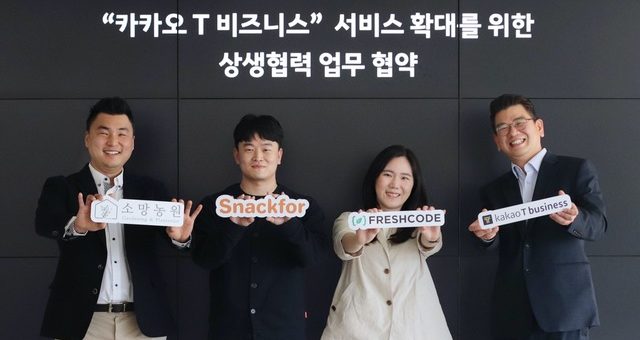 카카오 T 비즈니스, ‘토털 비즈니스 플랫폼’으로 육성 [서울=뉴시스]왼쪽부터 소망농원 박병준 대표, 스낵포 이웅희 대표, 프레시코드 유이경 이사, 카카오모빌리티 안규진 부사장 (사진=카카오모빌리티 제공) 2021.04.15 [서울=뉴시스] 이진영 기자 = 카카오모빌리티는 소망농원, 스낵포, 프레시코드 등 청년...