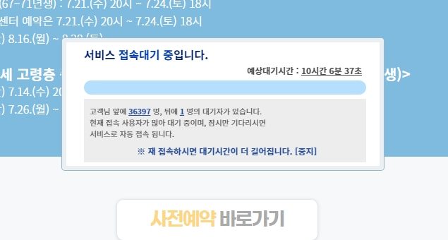 만 53~54세 대상 코로나바이러스감염증-19(코로나19) 백신 예방접종 사전예약이 19일 연거푸 ‘먹통’ 사태를 빚고 있다. ▶이날 오후 8시부터 진행된 사전예약이 코로나19 예방접종 사전예약 시스템 홈페이지 접속마비 상황에 따라 서버를 긴급히 증설한 후 오후 10시부터 재개될 예정이었는데, 정작 오후 10시 재개 이후...