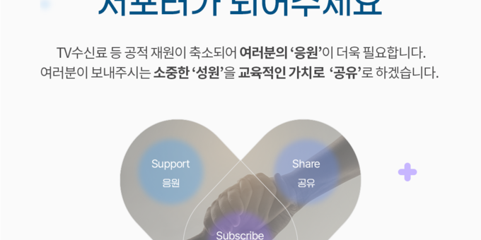 구독 장려 캠페인으로 위기 대응 EBS는 1일부터 ‘EBS 구독이 후원입니다’를 캐치프레이즈로 한 ‘EBS 서포터 캠페인<사진>’을 진행 중이다. 시청자들에게 EBS OTT 서비스인 ‘EBS 플레이 플러스’(Play+) 구독을 장려하는 캠페인이다. 그런데, 이 캠페인을 접한 시청자들의 반응이...