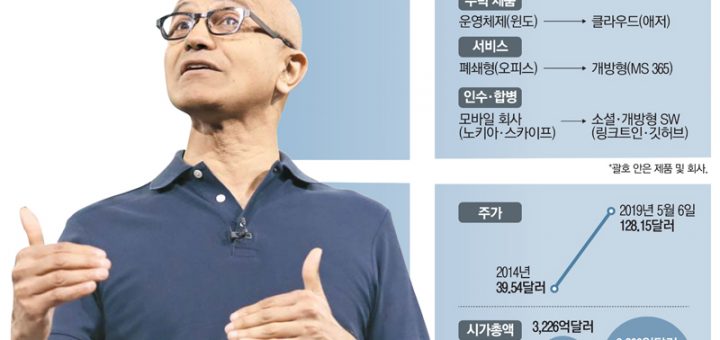 사티아 나델라 CEO, 개발자 콘퍼런스서 `파격` 맥OS·안드로이드와 플랫폼 호환성 확보 클라우드에 투자올인 MS `적과의 동침`전략에 주가 올들어 26% 올라 6일(현지시간) 미국 워싱턴주 시애틀 컨벤션센터(WSCC)에서 열린 마이크로소프트(MS) 연례 개발자 콘퍼런스(빌드 2019). 사티아 나델라 MS 최고경영자(CEO)가 기조연설...