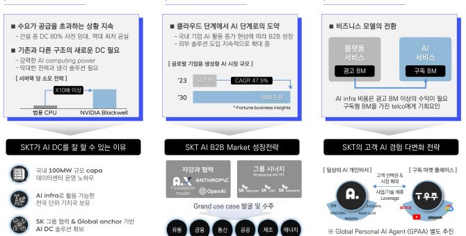 김양섭 SKT CFO, 3Q 컨퍼런스콜서 자신감 드러내 12월 중 가산에 AIDC 개소, GPUaaS 출시 AI 모델 적용한 B2B 그랜드 유스케이스 발굴 PAA 구독 모델 사업화 추진 [이데일리 임유경 기자] SK텔레콤(017670)이 인공지능(AI)를 통한 수익화에 자신감을 드러내며, 가장 단기에 성과를 기대할 수 있는 사업으로...