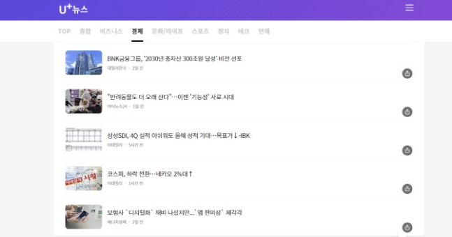 글로벌 광고회사 타불라와 제휴 고객에게는 무료로 아침마다 문자 제공 바쁜 아침 뉴스 골라 보내줘 인기 MAU 6만명 돌파..광고 수익 일부만 쉐어, BM은 아직 [이데일리 김현아 기자] ‘U+뉴스’ 사이트 화면. 이데일리를 포함한 언론사 뉴스들이 제공되고 있다. 사진=U+뉴스...
