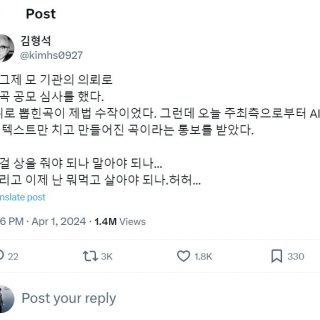 김형석 작곡가는 한 작곡 공모전에서 심사한 소회를 1일 X(옛 트위터)에 공유했다. 그가 훌륭하다고 평한 1위는 인공지능(AI)이 작곡한 것이다. (X 화면 갈무리) “이걸 상을 줘야 하나 말아야 하나, 그리고 이제 난 뭐 먹고 살아야 하나”...