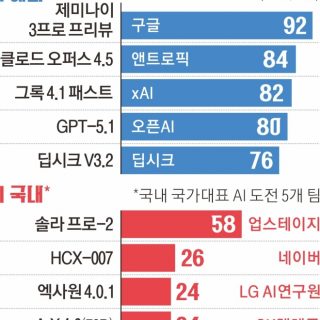 국가 AI 도전 5곳 해외 빅테크 비교구글·오픈AI 등 최저 70점대 후반 국내산 최고점 50점대 후반 그쳐 한국 모델 설계는 언어에 중점 둬 LG “자체 테스트에선 92점” 반박 국가대표 AI에 도전 중인 국내 기업들의 인공지능(AI) 모델들이 수학능력시험 수학 문제와...