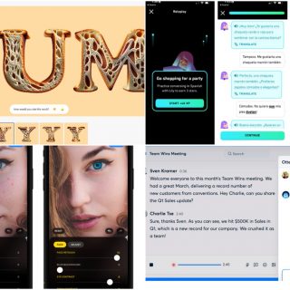 왼쪽 위부터 시계방향으로 글자 모양을 자유롭게 생성하는 어도비 파이어플라이, 챗봇과 실시간 대화를 통해 어학 학습을 지원하는 듀오링고, 녹음한 내용을 챗봇과 확인할 수 있는 오터AI, 인공지능으로 이미지를 바로잡아주는 프리스마 랩 렌사. 챗GPT를 계기로...