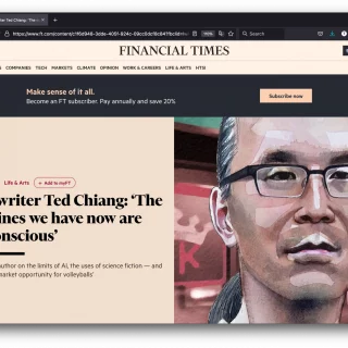 테드 창이 파이낸셜타임스와 인터뷰했다. 이 신문은 ‘FT와 점심을(lunch with the FT)’이라는 코너를 운영하고 있는데 기자가 테드 창에게 연락해서 점심을 먹자 했더니 사생활을 이야기하지 않는 조건으로 흔쾌하게 수락했다고 한다. 다음은 테드 창의 인터뷰 가운데 흥미로운...