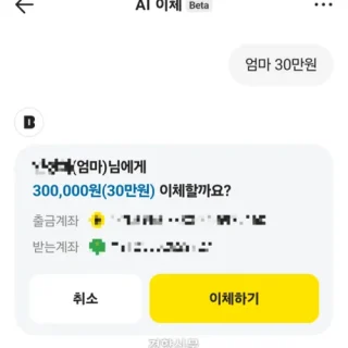 카카오뱅크가 24일 출시한 ‘AI 이체’ 서비스로 송금을 시도해봤다. 과거 이체 이력이 있는 계좌 별명과 금액을 입력한 뒤 이체하기를 누르고 비밀번호를 입력하니 송금이 완료됐다. 카카오뱅크 앱 갈무리 “엄마 30만원.” 인터넷 전문은행 카카오뱅크가 24일 국내...