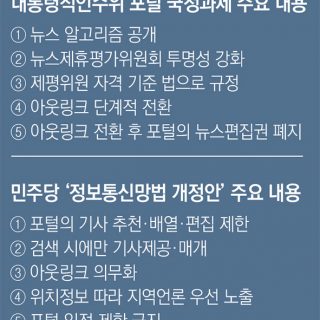 인수위의 포털 뉴스 개편·민주당의 망법 개정안이 언론계에 미칠 파장 제20대 대통령직인수위원회(인수위)가 윤석열 정부에서 포털 뉴스 서비스의 전면 개편을 예고했다. 뉴스 시장에서 막강한 권력을 행사하는 포털을 규제해 건전한 언론 생태계를 조성하겠다는 취지다. 언론개혁...