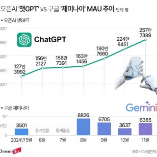 챗GPT MAU, 올해 2월 이후 10개월 연속 최고치 구글, 멀티모달 기능 강화 ‘제미나이 2.0’ 발표 韓 이용자 확대 위해 아이돌 섭외 마케팅도 그래픽=정서희 구글의 생성형 인공지능(AI) 서비스 ‘제미나이’가 한국 시장에서 오픈AI ‘챗GPT’에 밀리며 고전하고...